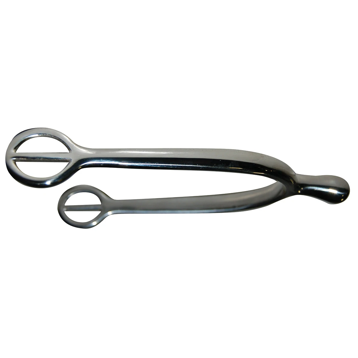 Knob end spur constructed of non-rusting Korsteel. Softly rounded end ideal for gentle but firm cues. Rounded strap slots make this spur fit smoothly against your boot.